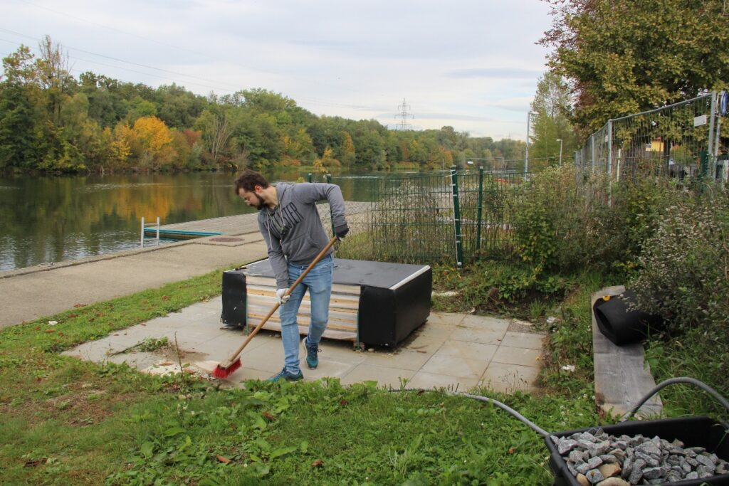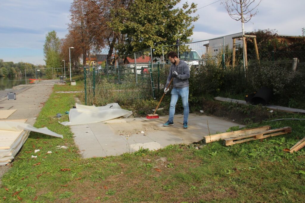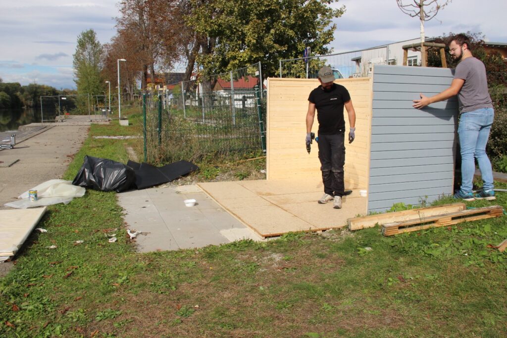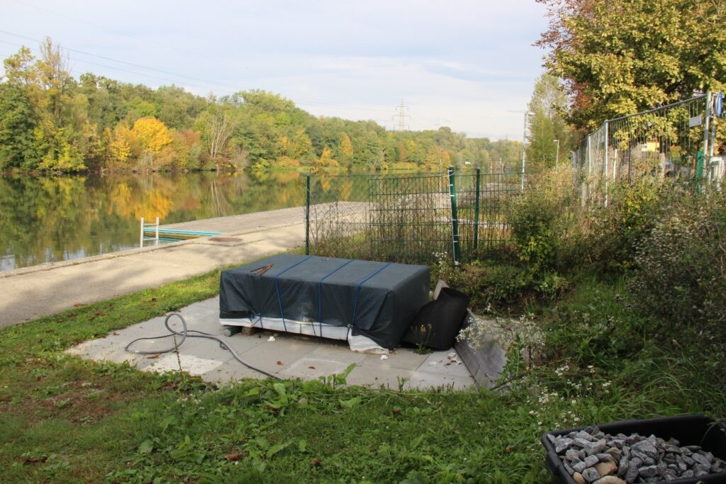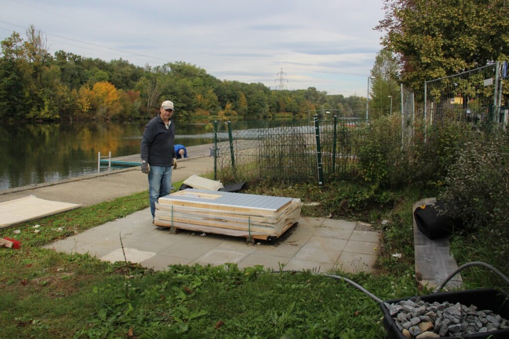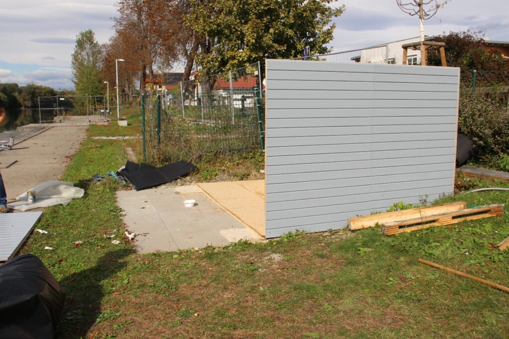 Was noch ergänzt werden wird, ist der Stromanschluss (das Kabel liegt ja schon seit dem Sommerfest 2024 in der Erde) und ein (System-) Schloss an der Türe. In der Hütte werden dann noch einige Regale aufgestellt, in denen dann all das, was jetzt im Bootshaus hinter den Booten und in jeder Ecke und Nische untergebracht ist und nicht direkt zum Rudern benötigt wird, gelagert werden kann.