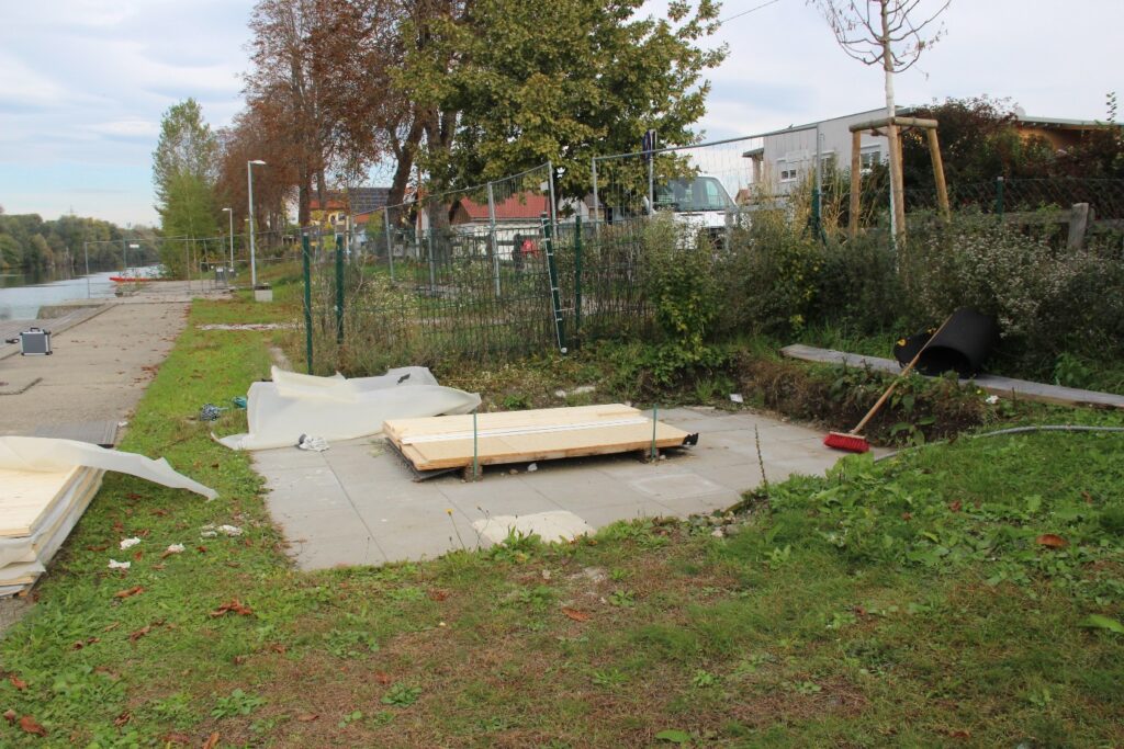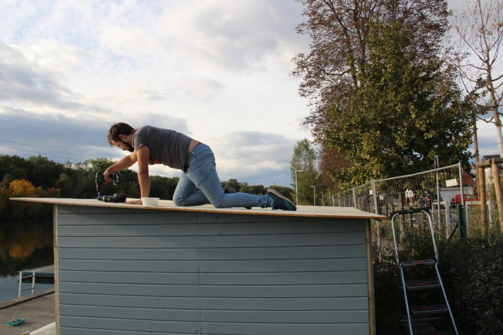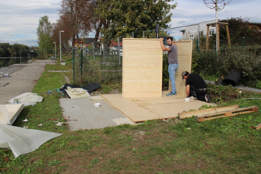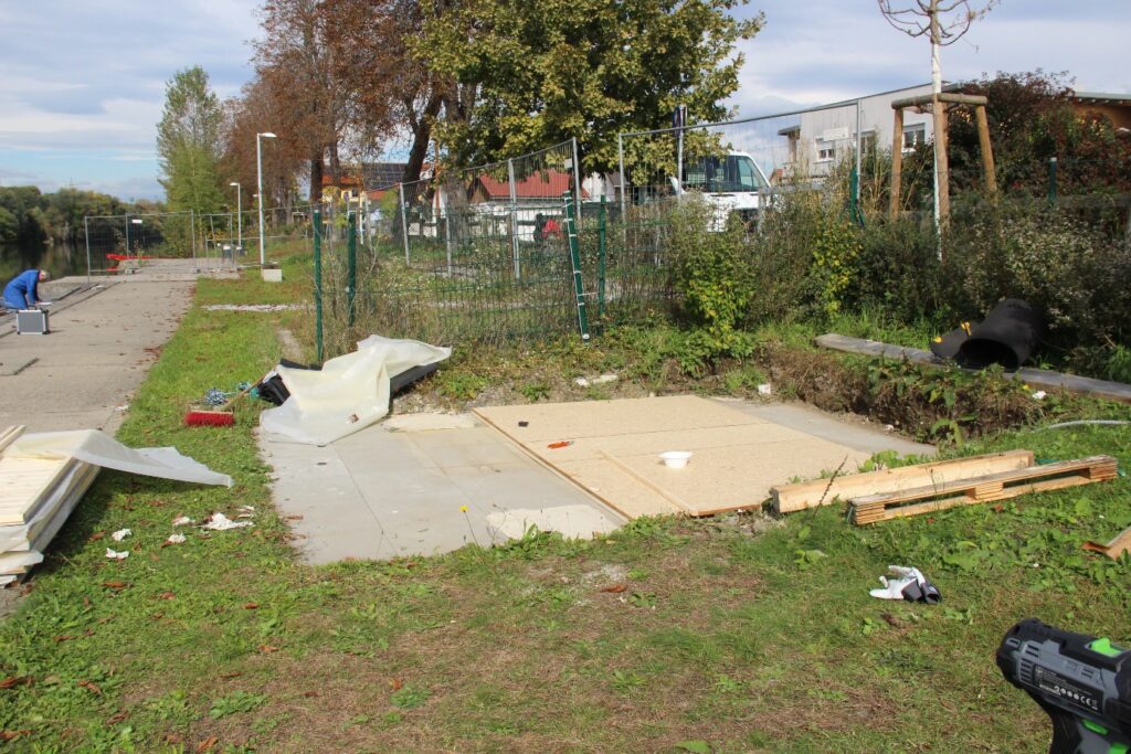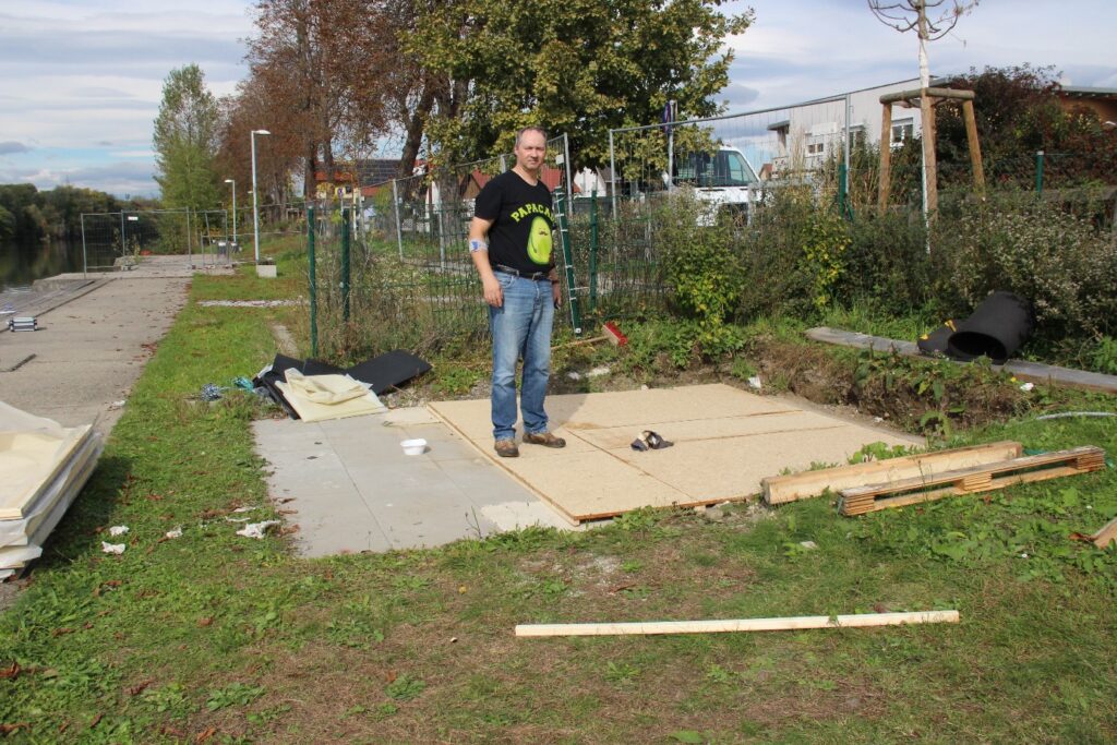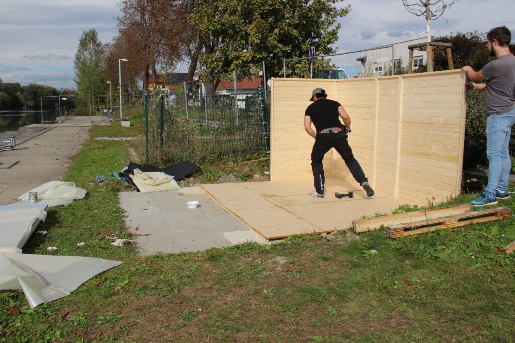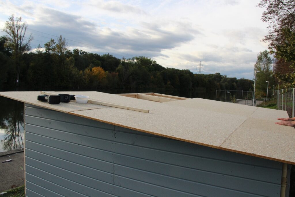 Am darauffolgenden Montag habe ich noch weiteres Zubehör besorgt und gemeinsam mit dem zufällig anwesenden Christian Muschik eingebaut. Dabei handelte es sich um einen PVC-Bodenbelag, der eingepasst werden musste. Eine Dachrinne hat den Aufbau dann komplettiert.