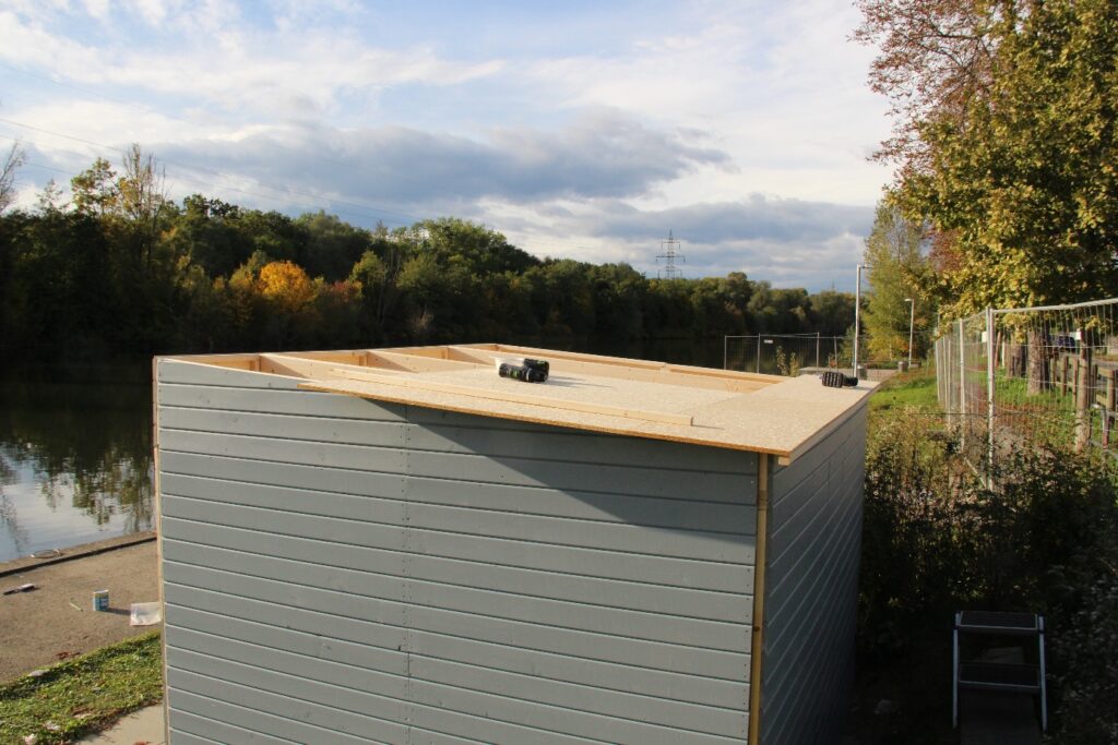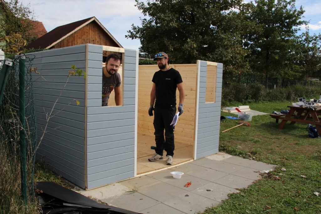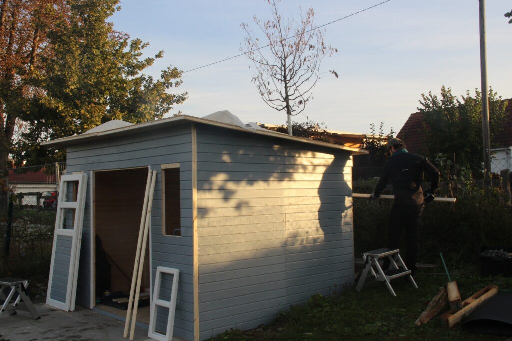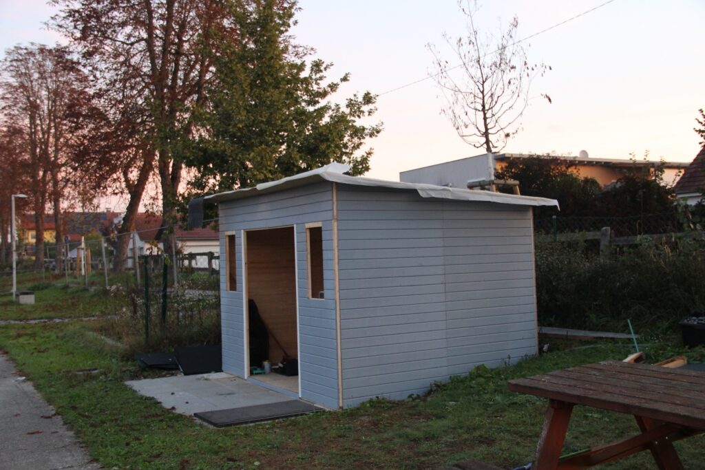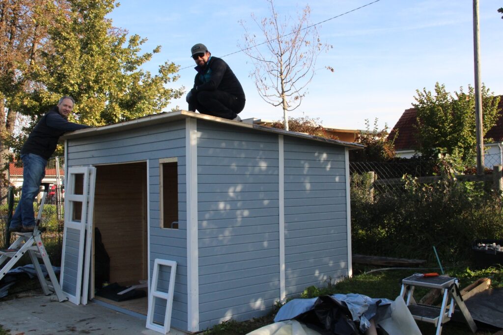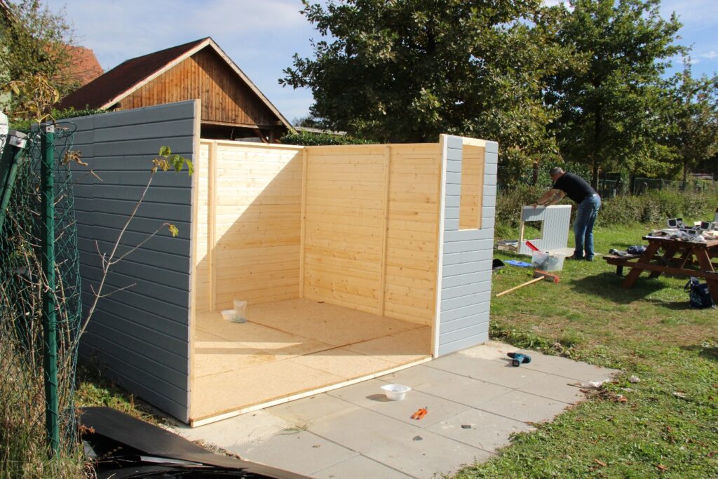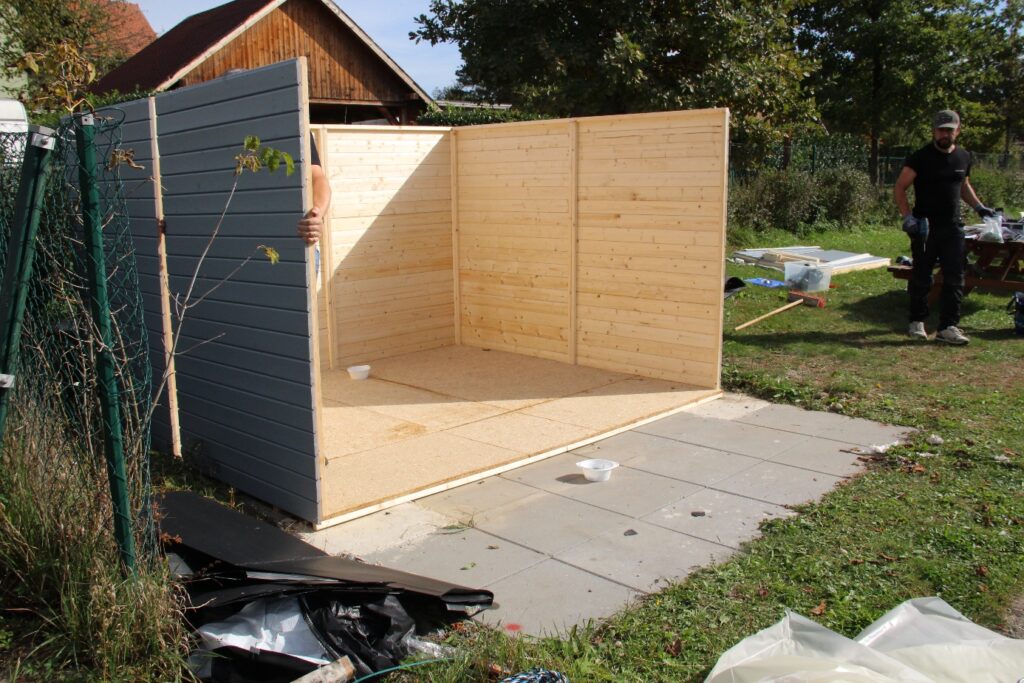 Nach mehreren vergeblichen Versuchen im Laufe des Sommers ist es jetzt endlich gelungen, die Gartenhütte, die schon seit fast zwei Jahren auf dem Clubgelände gelagert war, aufzubauen. Am 10.10.2025 startete die Aktion bei strahlendem Herbstwetter. Begonnen haben wir zu zweit, ab Mittag dieses Tages arbeiteten wir dann zu dritt weiter. Allein das Auspacken aller Teile dauerte mehrere Stunden und wir haben die Bodenplatten auf der Unterseite mit einem Schutzanstrich versehen, um sie gegen Feuchtigkeit abzudichten. Am ersten Tag dauerten die Arbeiten von 10:00 bis 17:00 Uhr. Bis dahin konnten wir den Aufbau bis zum Roh-Dach fertigstellen. Zum Glück haben wir das Dach über Nacht mit Plastikplanen abgedeckt. So blieb es trocken, denn am nächsten Morgen war alles mit Tau bedeckt.
