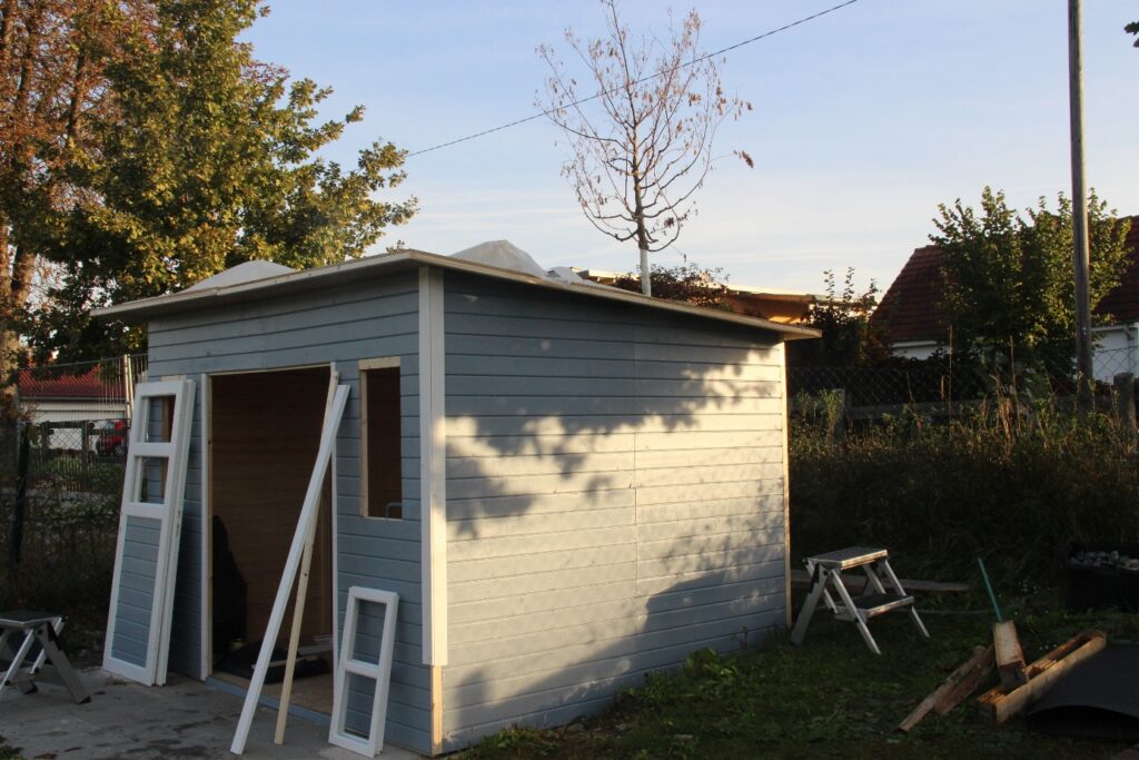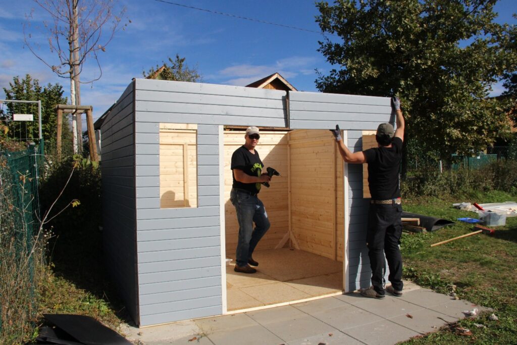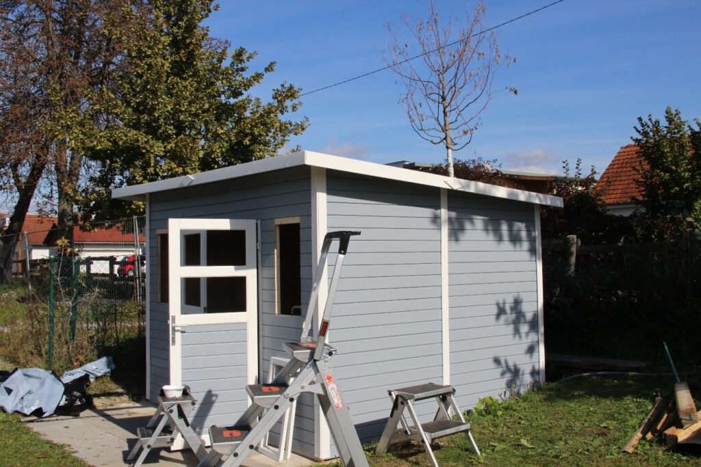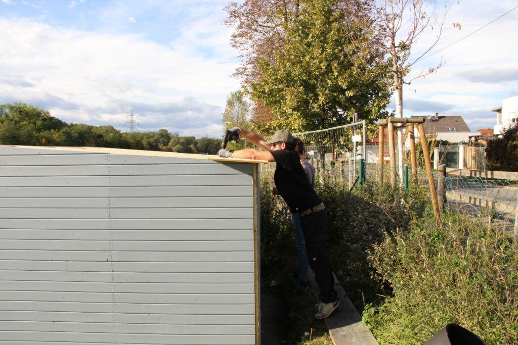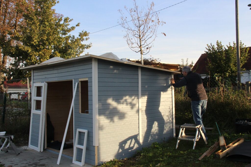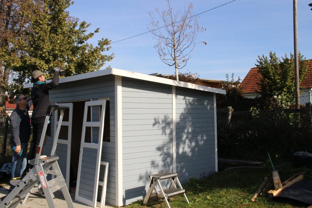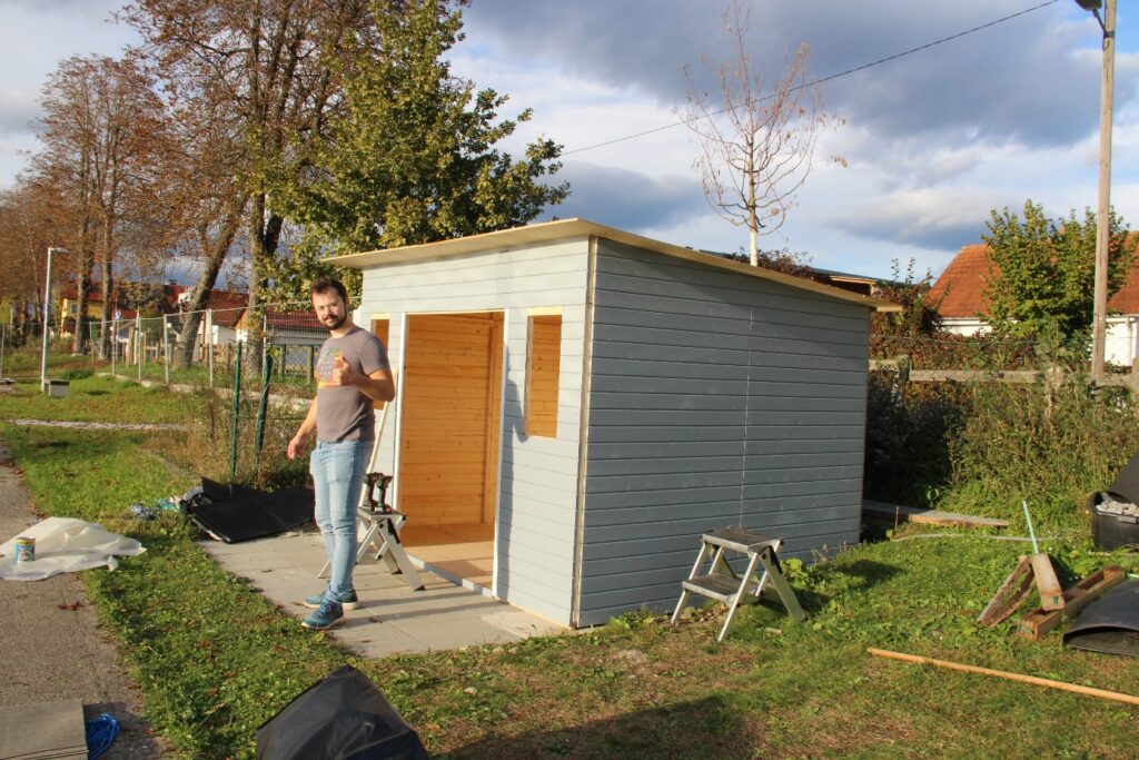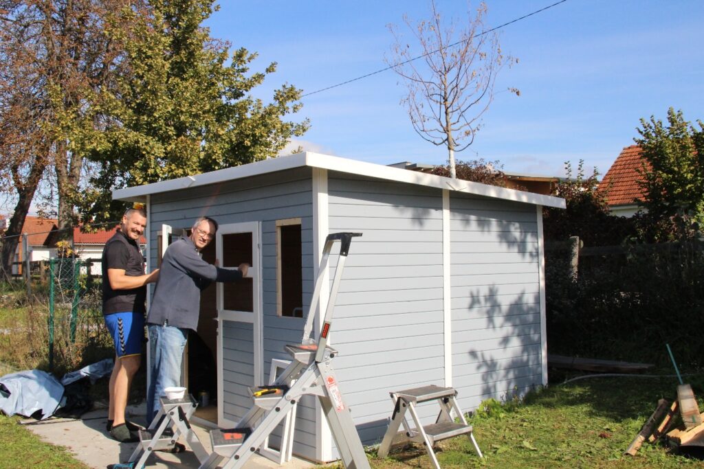 Nach mehreren vergeblichen Versuchen im Laufe des Sommers ist es jetzt endlich gelungen, die Gartenhütte, die schon seit fast zwei Jahren auf dem Clubgelände gelagert war, aufzubauen. Am 10.10.2025 startete die Aktion bei strahlendem Herbstwetter. Begonnen haben wir zu zweit, ab Mittag dieses Tages arbeiteten wir dann zu dritt weiter. Allein das Auspacken aller Teile dauerte mehrere Stunden und wir haben die Bodenplatten auf der Unterseite mit einem Schutzanstrich versehen, um sie gegen Feuchtigkeit abzudichten. Am ersten Tag dauerten die Arbeiten von 10:00 bis 17:00 Uhr. Bis dahin konnten wir den Aufbau bis zum Roh-Dach fertigstellen. Zum Glück haben wir das Dach über Nacht mit Plastikplanen abgedeckt. So blieb es trocken, denn am nächsten Morgen war alles mit Tau bedeckt.