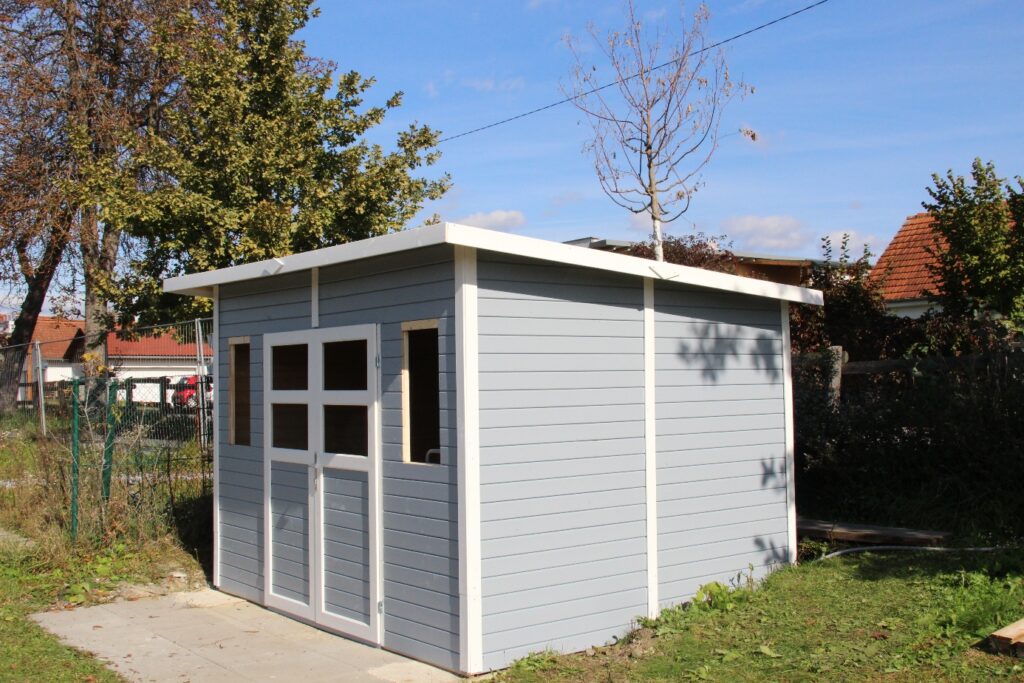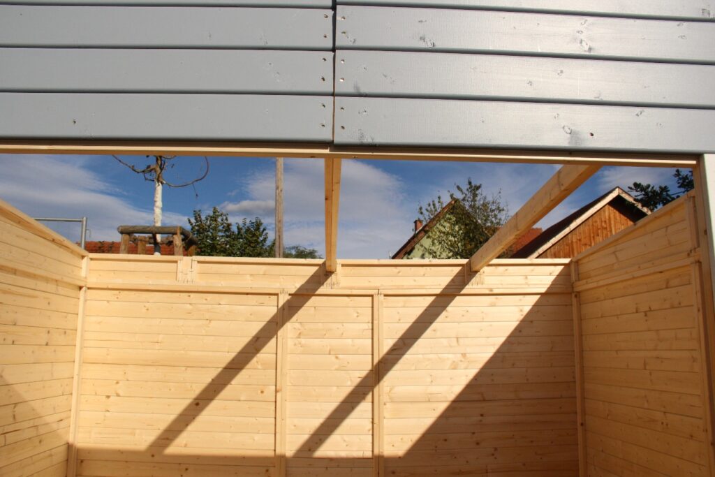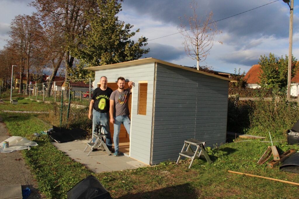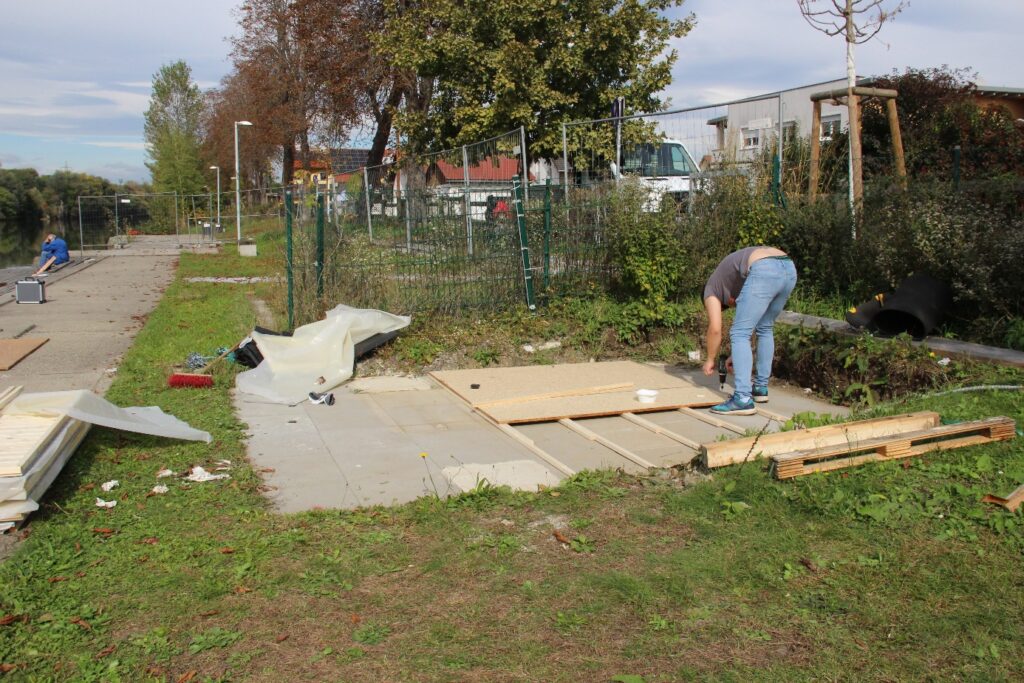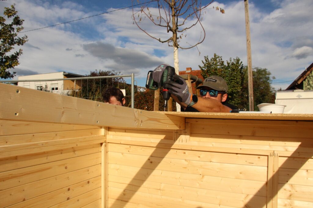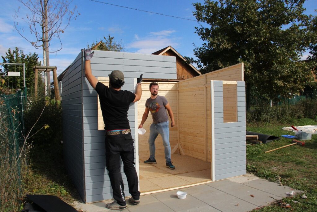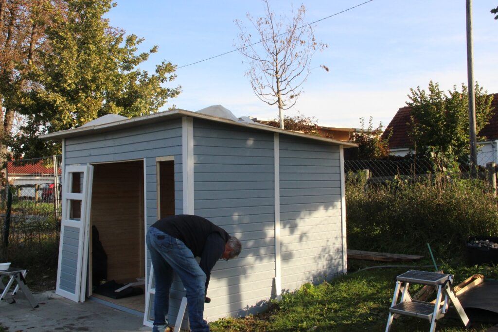 Nach mehreren vergeblichen Versuchen im Laufe des Sommers ist es jetzt endlich gelungen, die Gartenhütte, die schon seit fast zwei Jahren auf dem Clubgelände gelagert war, aufzubauen. Am 10.10.2025 startete die Aktion bei strahlendem Herbstwetter. Begonnen haben wir zu zweit, ab Mittag dieses Tages arbeiteten wir dann zu dritt weiter. Allein das Auspacken aller Teile dauerte mehrere Stunden und wir haben die Bodenplatten auf der Unterseite mit einem Schutzanstrich versehen, um sie gegen Feuchtigkeit abzudichten. Am ersten Tag dauerten die Arbeiten von 10:00 bis 17:00 Uhr. Bis dahin konnten wir den Aufbau bis zum Roh-Dach fertigstellen. Zum Glück haben wir das Dach über Nacht mit Plastikplanen abgedeckt. So blieb es trocken, denn am nächsten Morgen war alles mit Tau bedeckt.