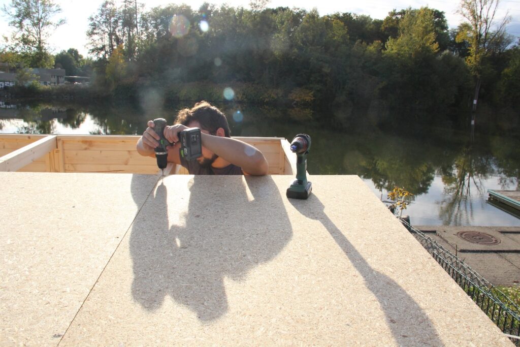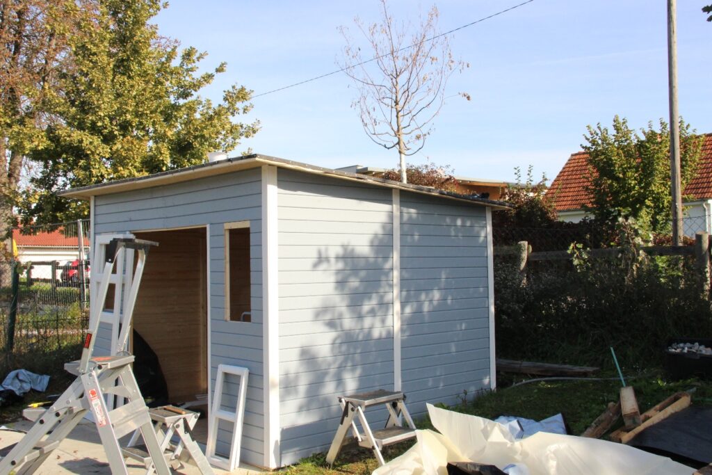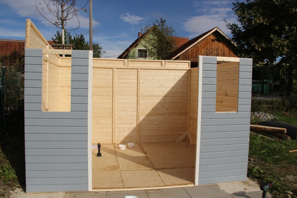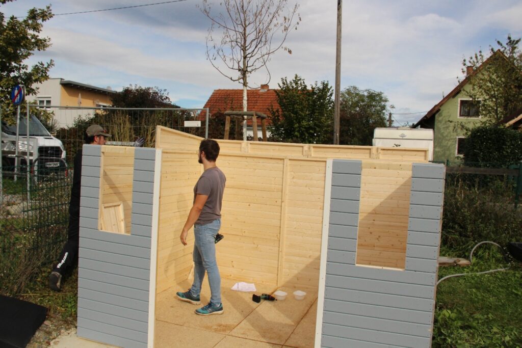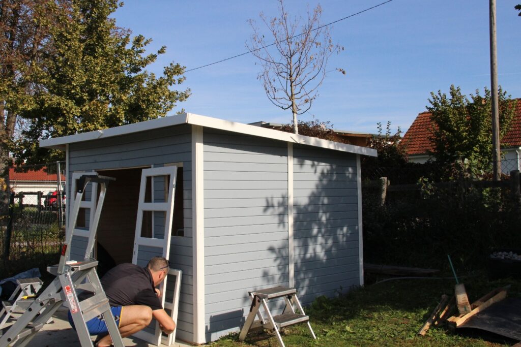 Die Fortsetzung am Tag 2 begann um 07:00 Uhr und dauerte bis 14:00 Uhr. An diesem Tag arbeiteten wir ebenfalls zu zweit und zeitweise wieder zu dritt. Das Dach wurde mit einer zusätzlichen Teerfolie bedeckt, die unter der mitgelieferten Dachpappe aufgeklebt wurde. Der Aufbau aller Teile (Einbau der Fenster, Anbringen aller Zierleisten) war dann am dritten Tag beendet. Zusätzlich wurde der Boden auch noch auf der Trittseite mit einem Schutzanstrich versehen.
